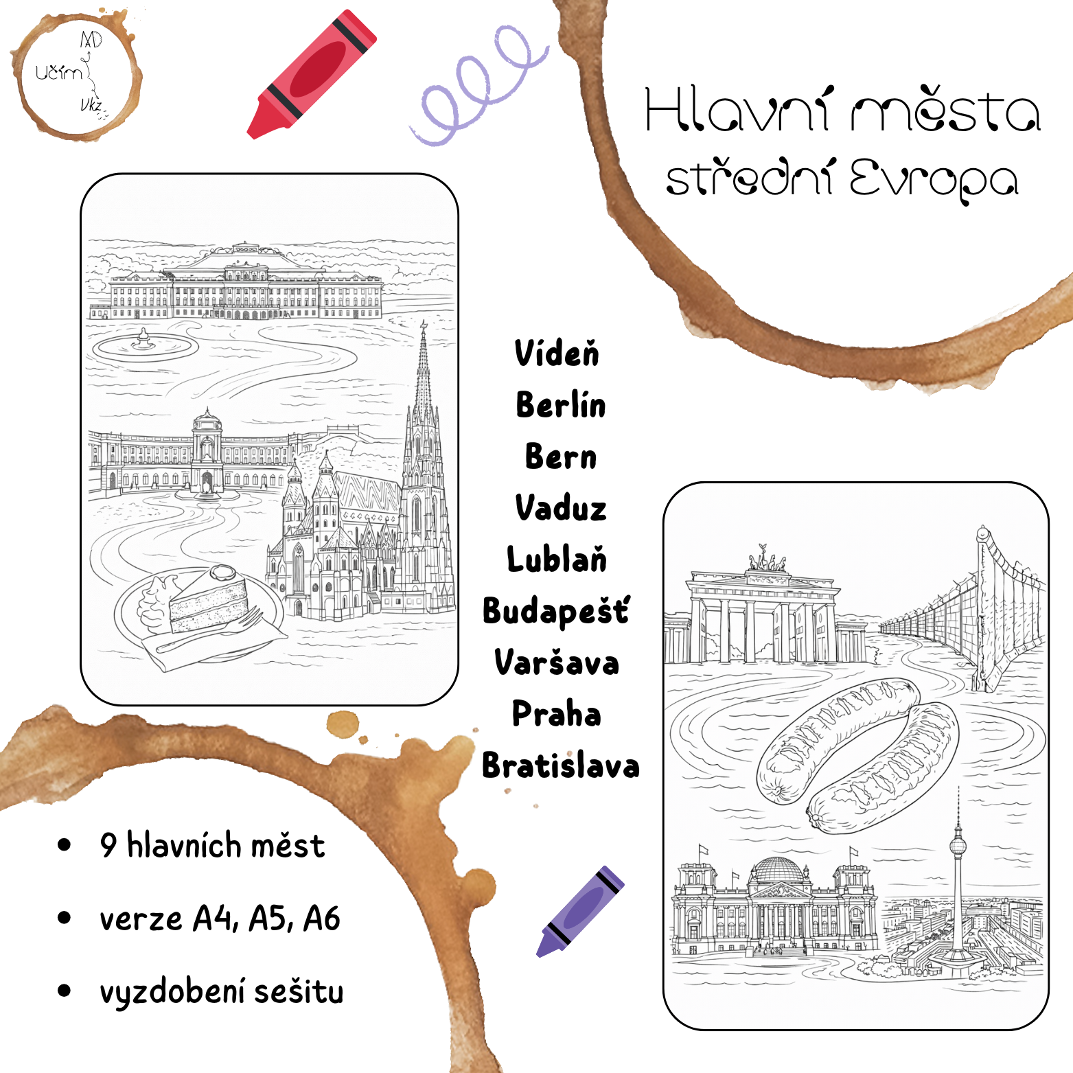 Materiál je určený pro žáky základní školy jako doplnění zápisků do sešitu. Obsahuje 9 omalovánek hlavních měst střední Evropy, jejich nejznámější památky, jídlo či pití. Obsahuje řešení pro učitele. Verze A4, A5 i A6.