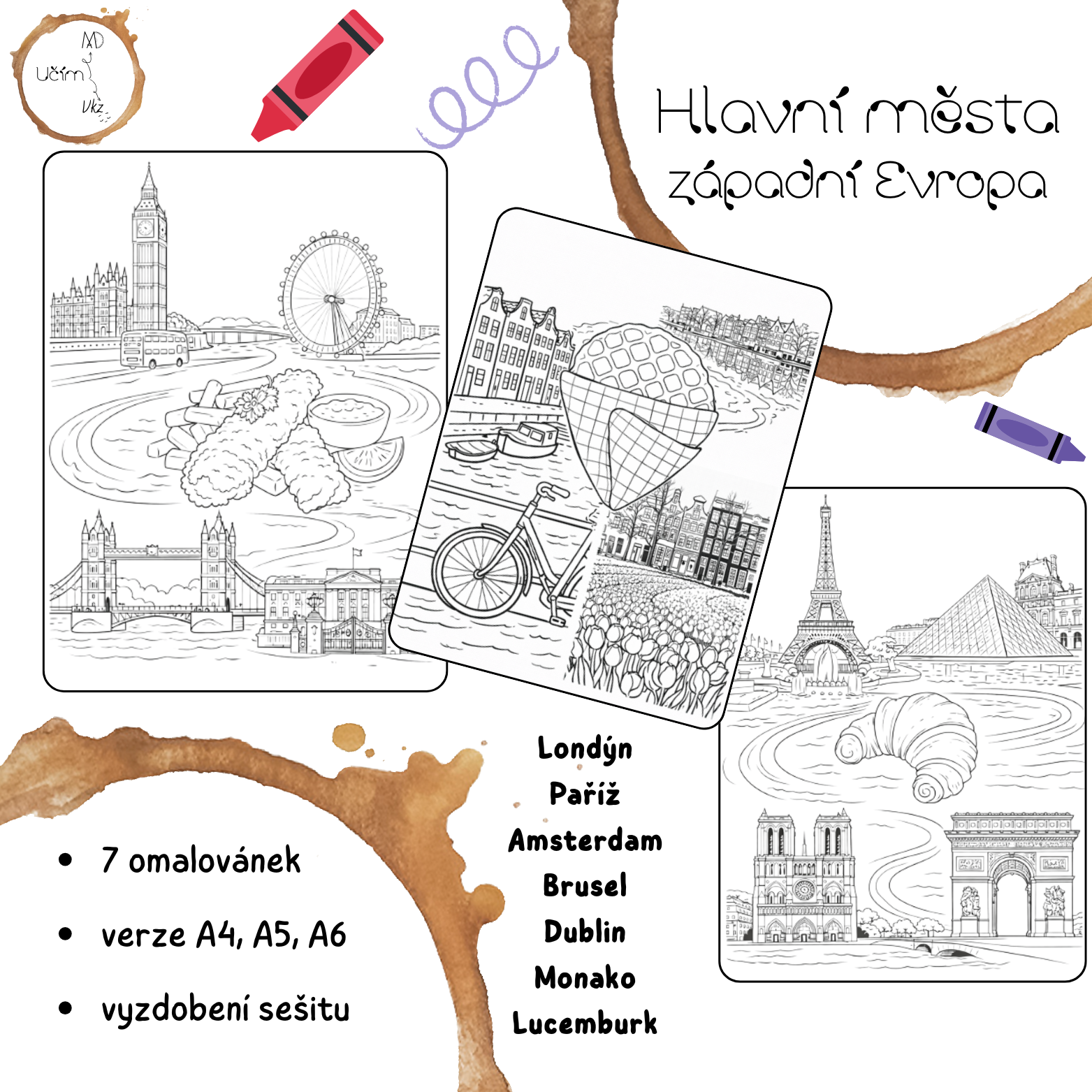 Materiál obsahuje 5 omalovánek hlavních měst Evropy. Verze A4, A5 i A6.Hlavní města:LondýnPařížAmsterdamBruselDublinMonakoLucemburk