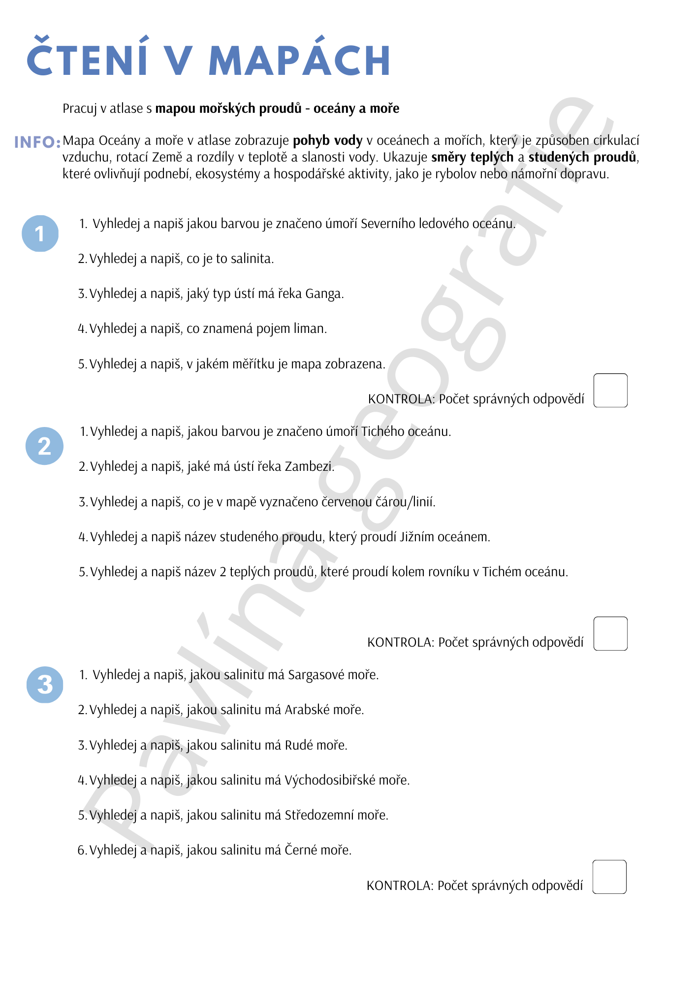 Součástí materiálu je pracovní list, ve kterém žáci podle zadaných informací vyhledávají správné mapové strany a plní jednotlivé úkoly. Ty jsou sestaveny tak, aby se žáci aktivně učili pracovat s mapou a legendou. K pracovnímu listu je připravena kontrola, která umožňuje vlastní sebereflexi – žáci si zapisují počet správných odpovědí, důraz je kladen na motivaci a pozitivní zpětnou vazbu.