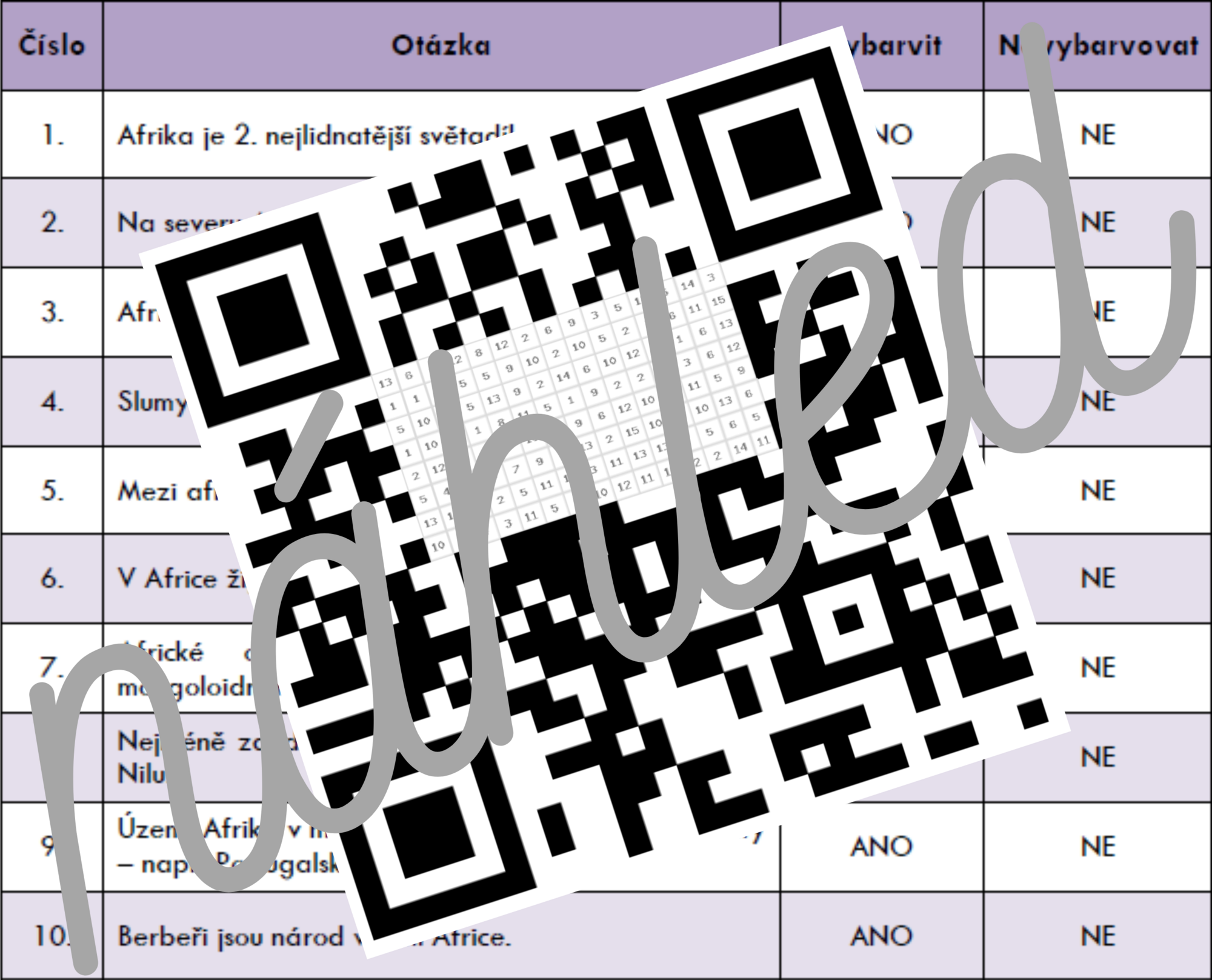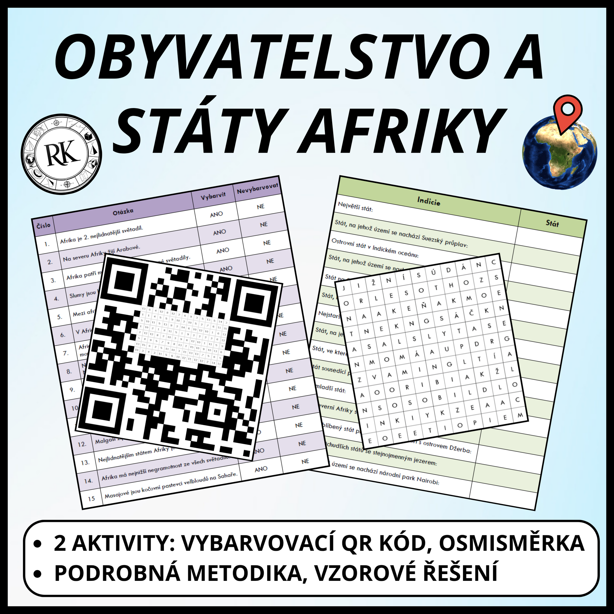 Vzdělávací materiál obsahuje 2 aktivity - pracovní list s vybarvovacím QR kódem na téma obyvatelstvo Afriky a pracovní list s otázkami a osmisměrkou na téma státy Afriky. Součástí materiálu je správné řešení. Každý materiál stačí vytisknout a ihned využít v hodině.