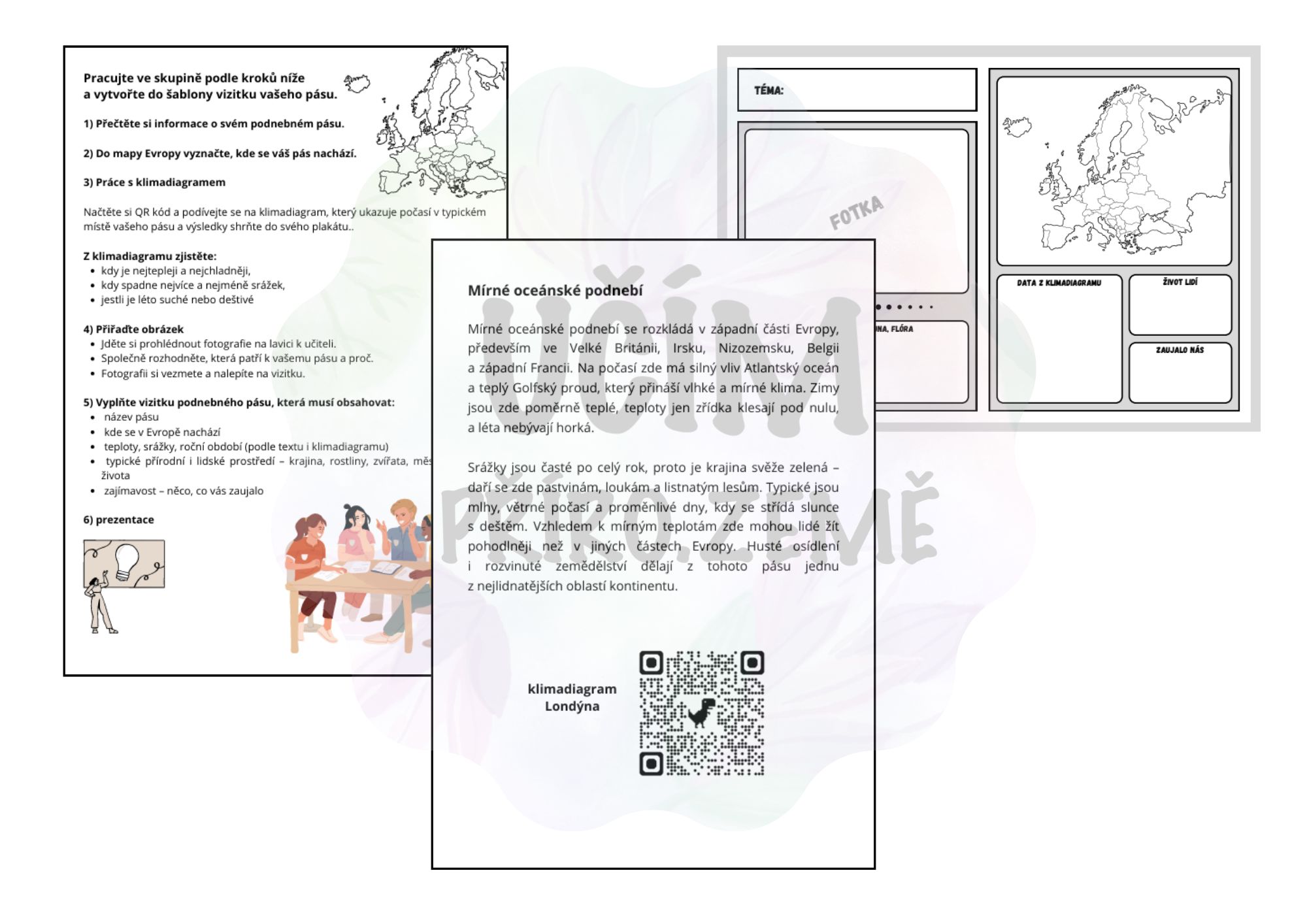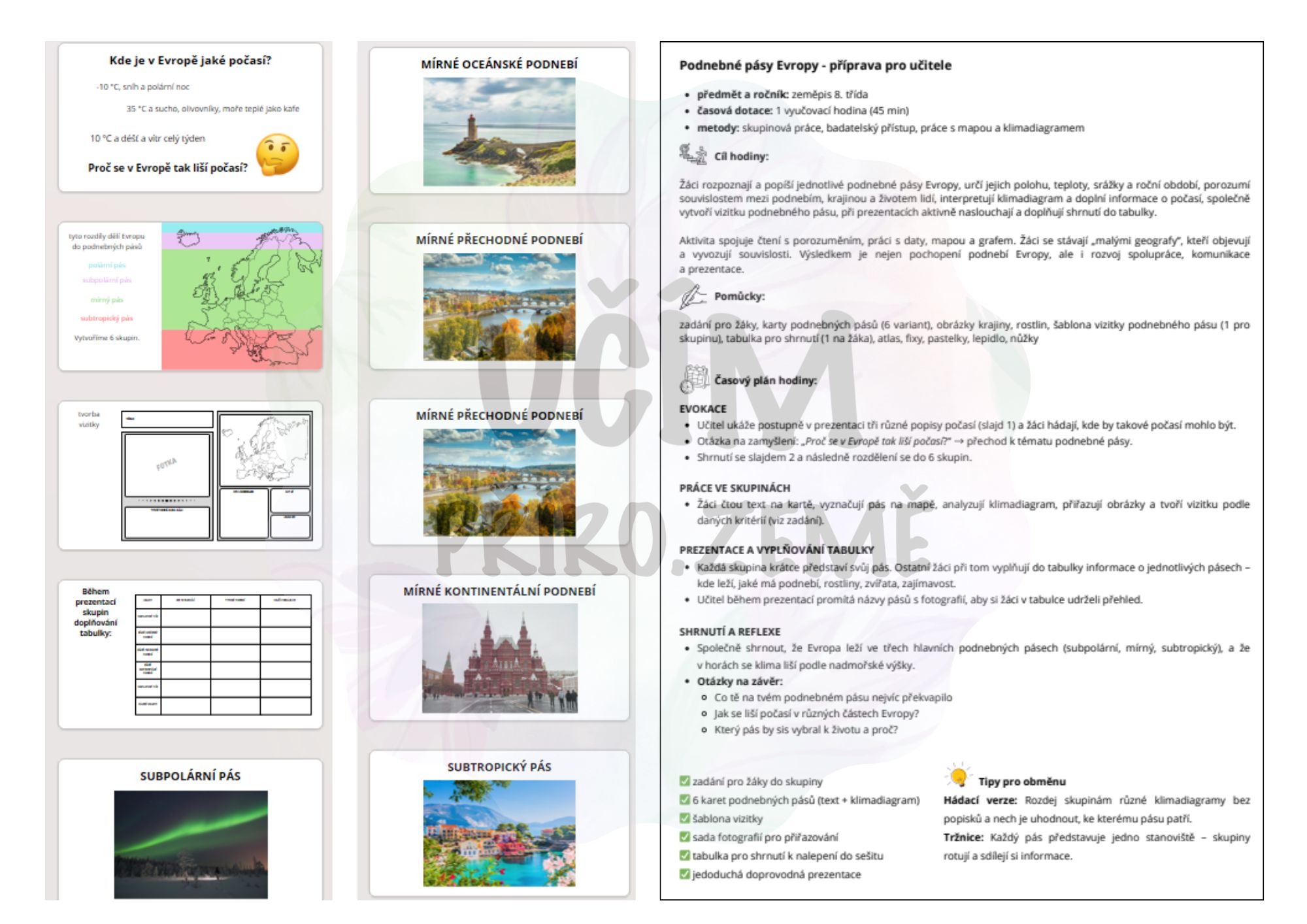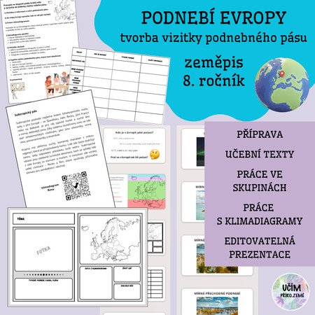 Žáci rozpoznají a popíší jednotlivé podnebné pásy Evropy, určí jejich polohu, teploty, srážky a roční období, naučí se číst a vyhodnotit klimadiagram a pochopí souvislosti mezi podnebím, krajinou a životem lidí. Každá skupina vytvoří vlastní vizitku podnebného pásu, kterou na závěr představí ostatním.