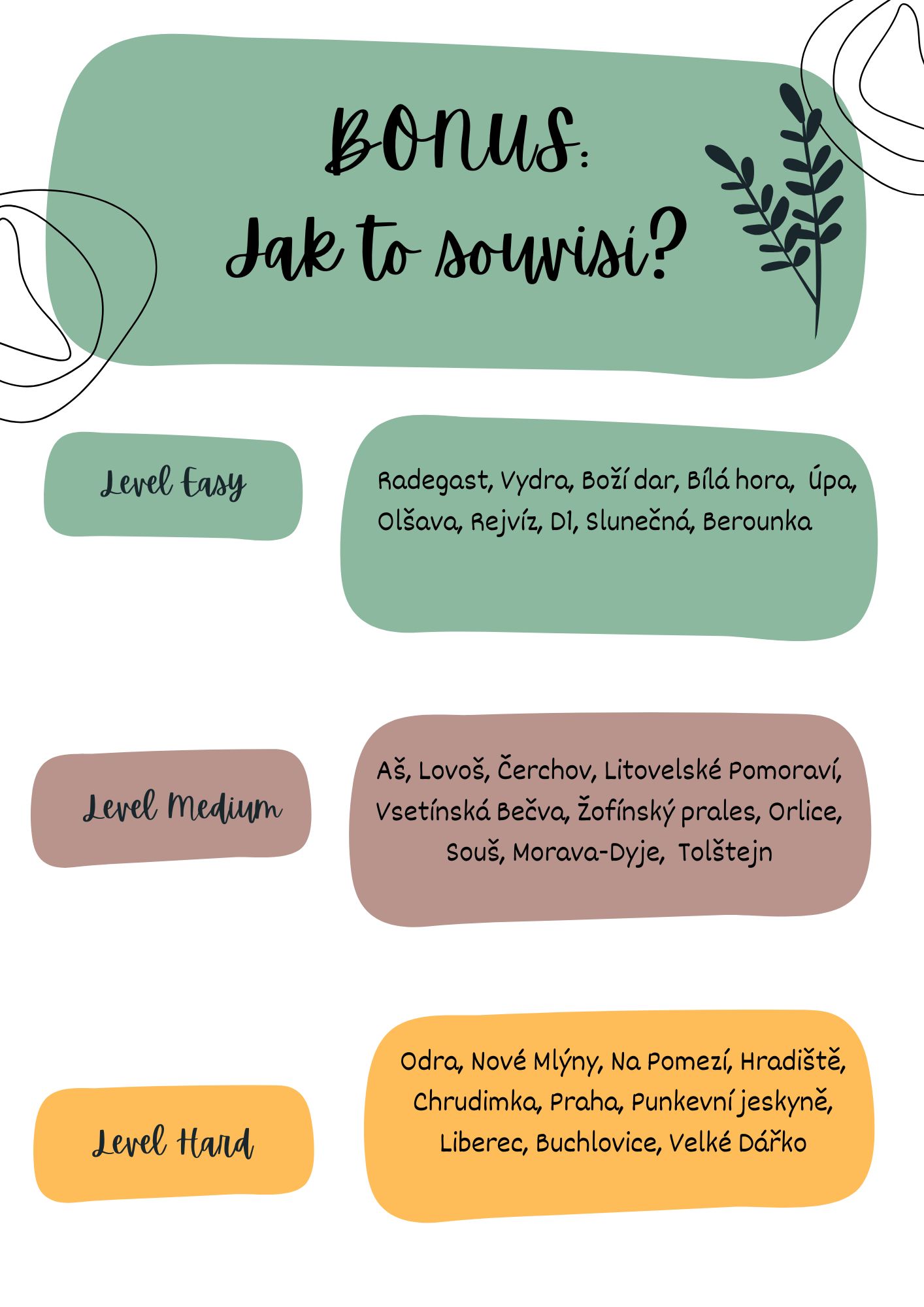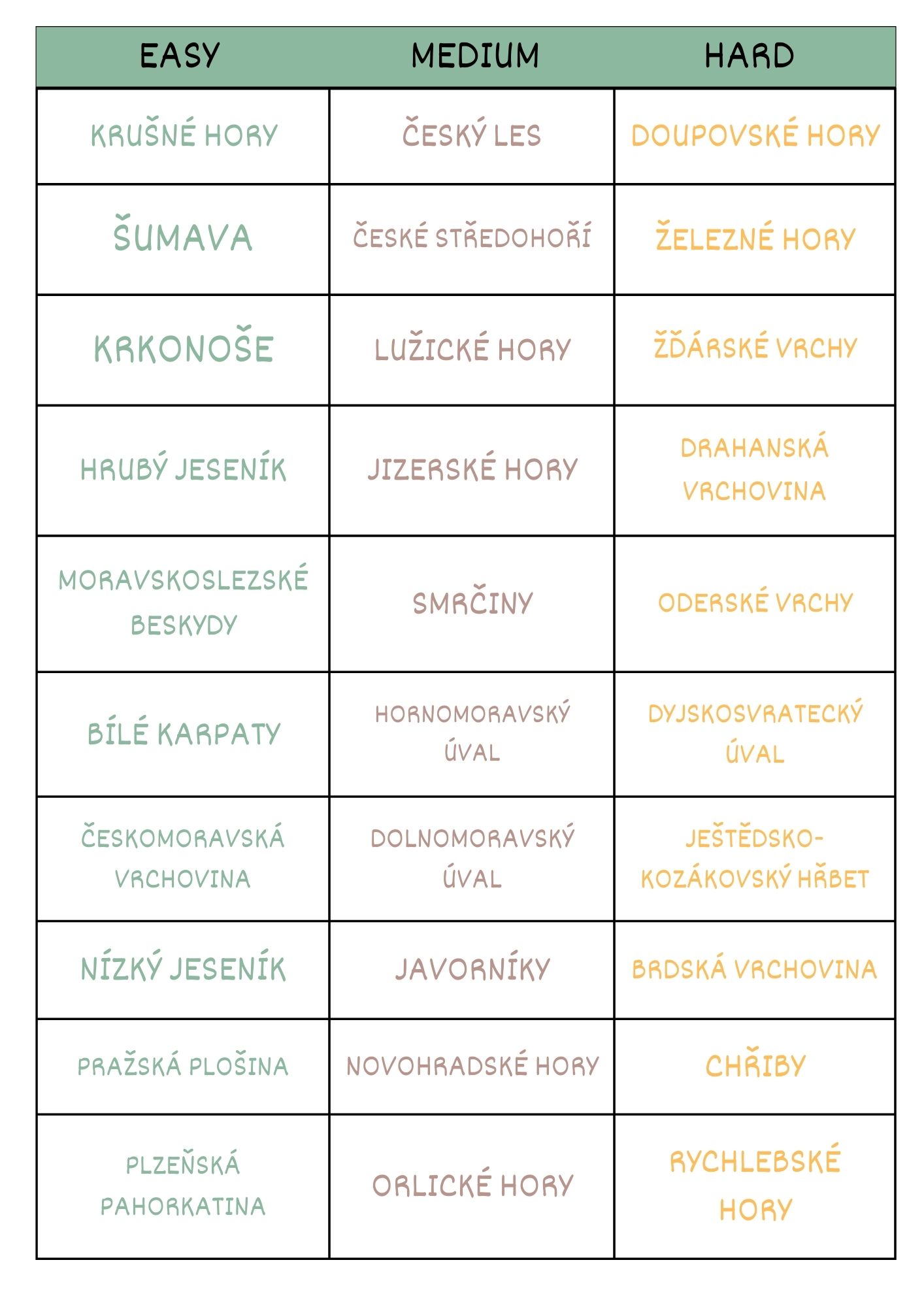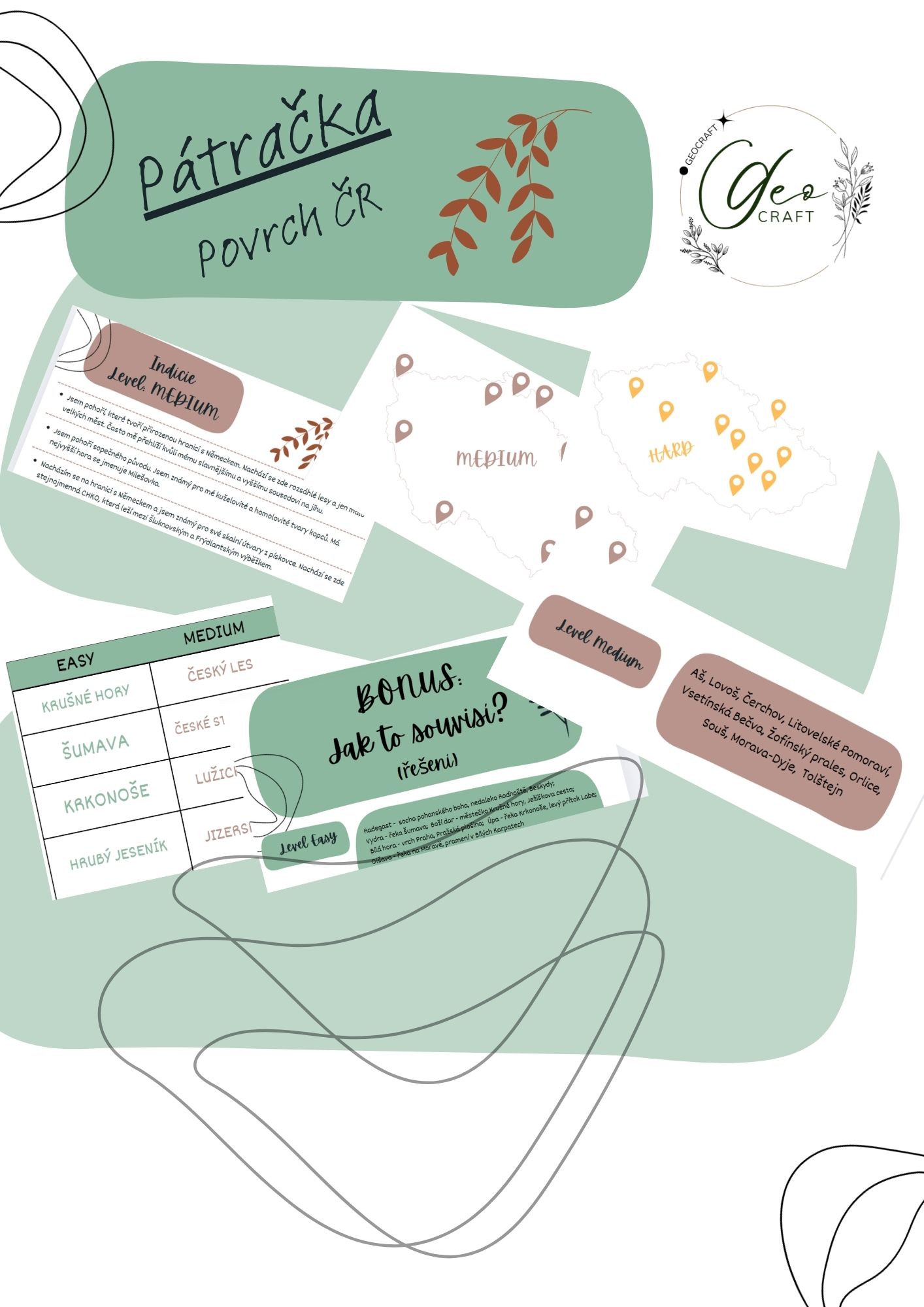 Materiál se týká učiva povrchu ČR. Obsahuje 30 pojmů z daného tématu. Pojmy jsou rozdělené dle obtížnosti, viz náhled. Materiál vyžaduje práci s atlasem. Jako pomůcka může sloužit mapa, na které jsou přibližně pojmy zanesené, ale nejsou pojmenované. Materiál také obsahuje bonus pro rychlíky a to pojmy, které určitým způsobem souvisí s názvy pohoří a nížin. Je zde řešení k indíciím a bonusovému materiálu.