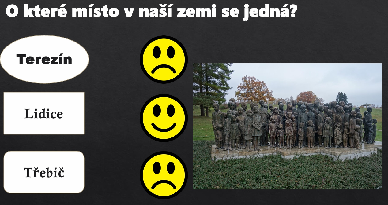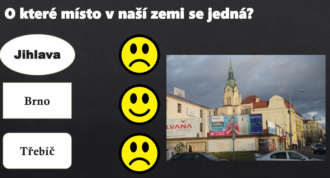 Na každém obrázku prezentace je jedna otázka a tři možné odpovědi. Správnou odpověď poznáte podle toho, že se vám objeví usmívající smajlík. Zasmušilý smajlík znamená špatnou odpověď. PowerPointová prezentace obsahuje celkem 29 snímků. Na možné odpovědi je potřeba kliknout myší, na další stránku prezentace stačí zmáčknout tlačítko enter.