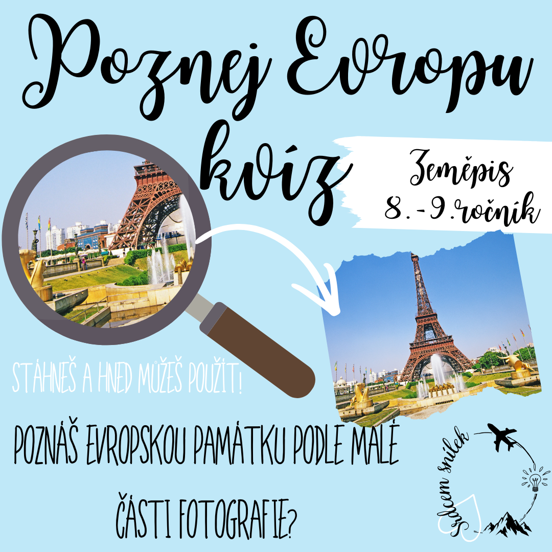 Zábavné procvičování turistických míst a signifikantních věcí daných států Evropy. Materiál je vhodný pro žáky 8. - 9. ročníku v rámci opakování Evropy. Žáci se snaží na základě malé části fotografie rozpoznat památku. V druhé části přiřazují stát k věci, která je s danou zemí spojená.