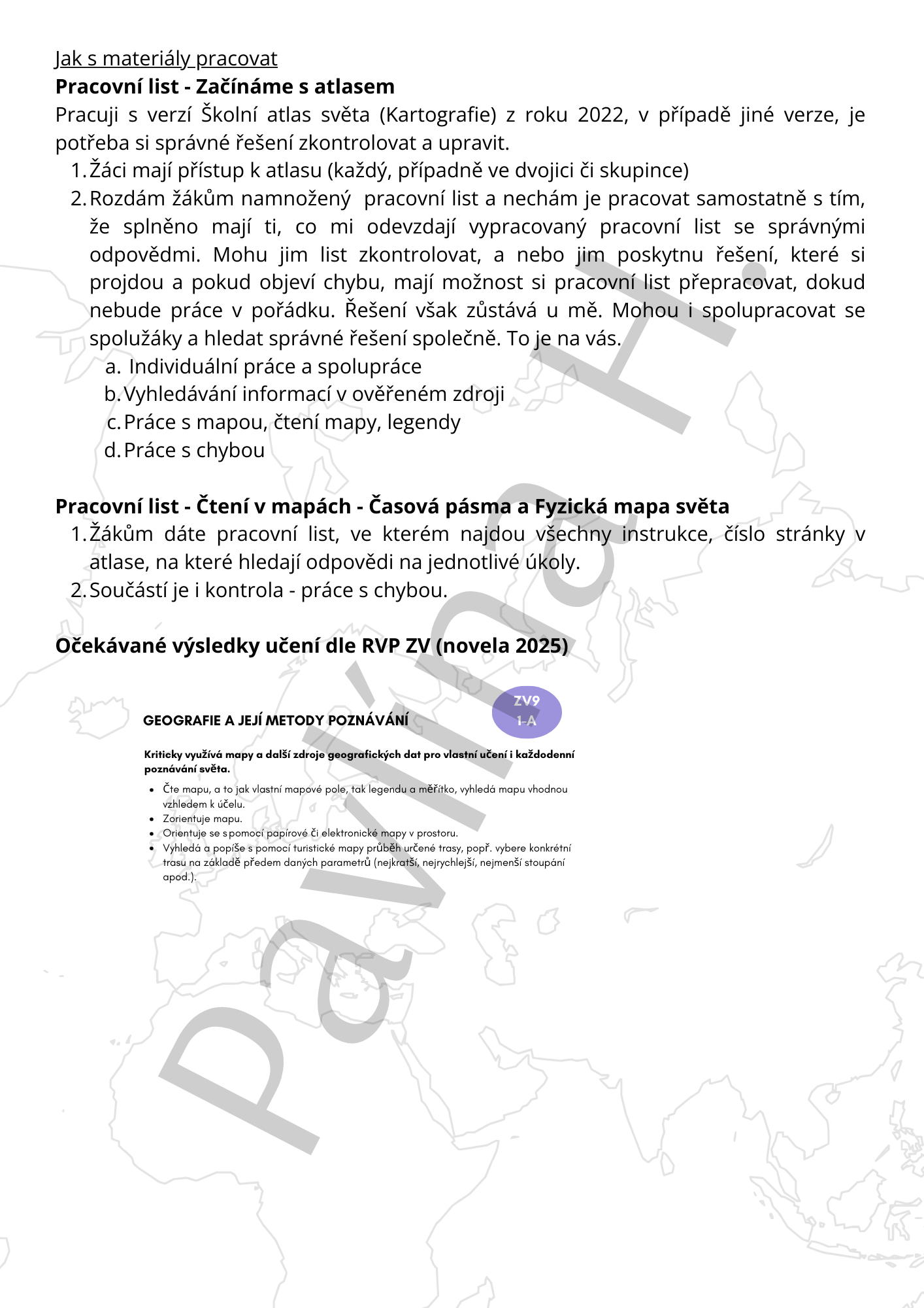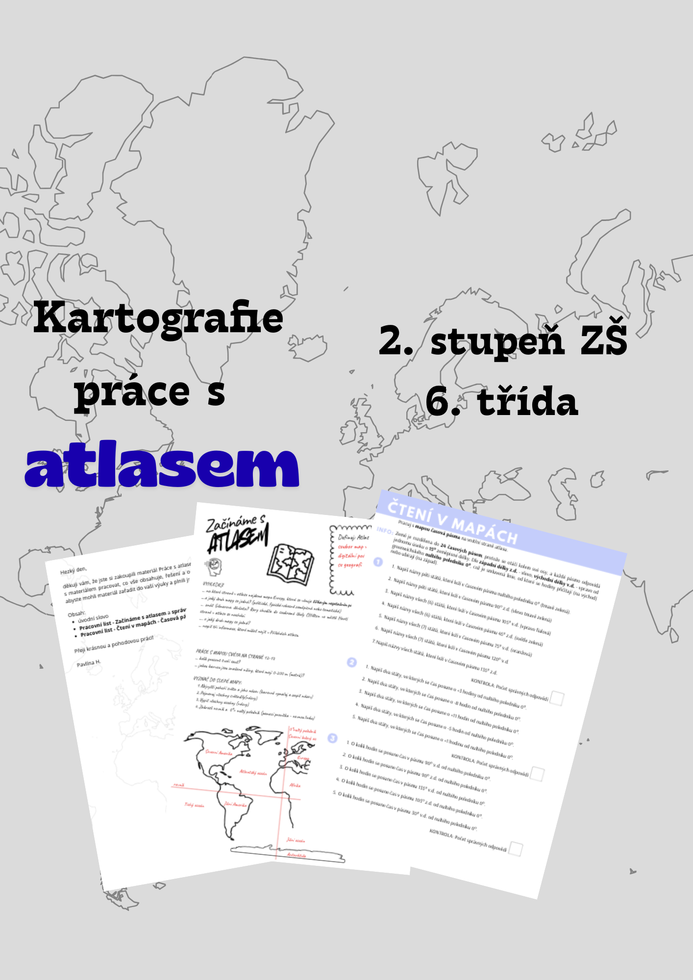 Materiál práce s atlasem je určen pro žáky druhého stupně ZŠ, kteří začínají s tématem kartografie a prací s tištěnými mapami. K vypracování pracovních listů potřebují atlasy a psací potřeby. Materiál je rozdělen do několika pracovních listů. První žáky seznamuje s tištěným atlasem světa. Učí je, jak se v něm orientovat, kde najdou obsah, kde rejstřík atd. Důraz je kladen na objevování, ať už individuálně nebo ve skupině. Nechte žáky si atlas prolistovat, ať si sami přijdou na to, jak tento cenný nástroj používat. Součástí je i vyplnění slepé mapy se základními pojmy. Poslední částí jsou příklady pro práci s Mapou časových pásem a Fyzickou mapou světa. Samozřejmostí je řešení a kontrola.