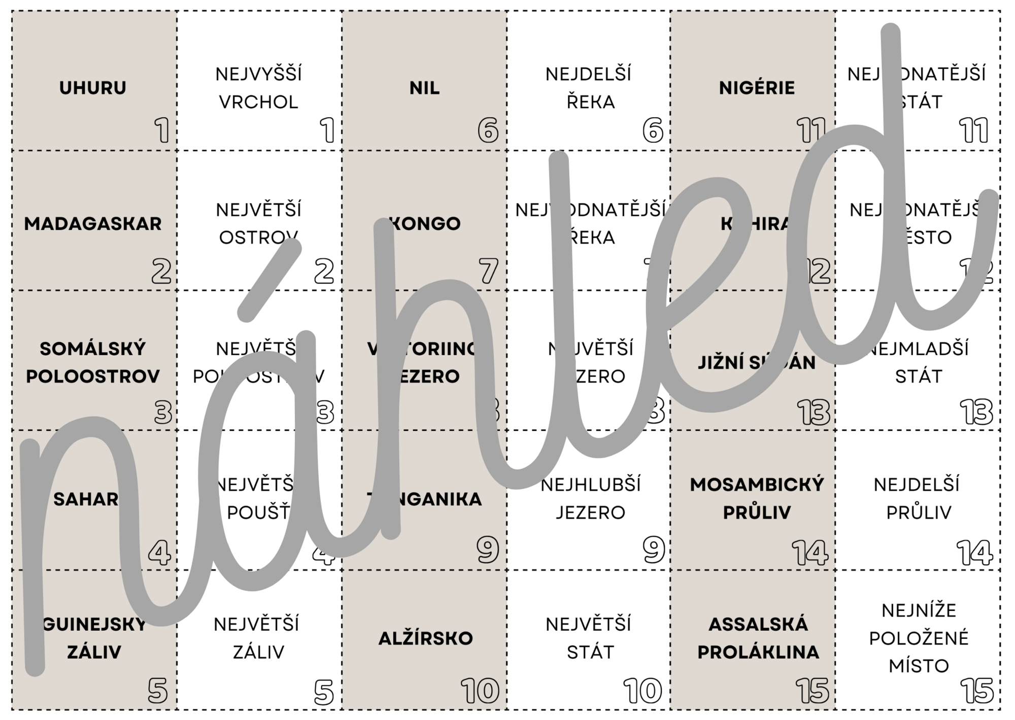 Jedná se o vzdělávací materiál pro výuku zeměpisu na 2. stupni ZŠ, který rozvíjí kompetence k učení, komutativnost a spolupráci. Žáci si během aktivity zopakují zeměpisné rekordy Afriky.