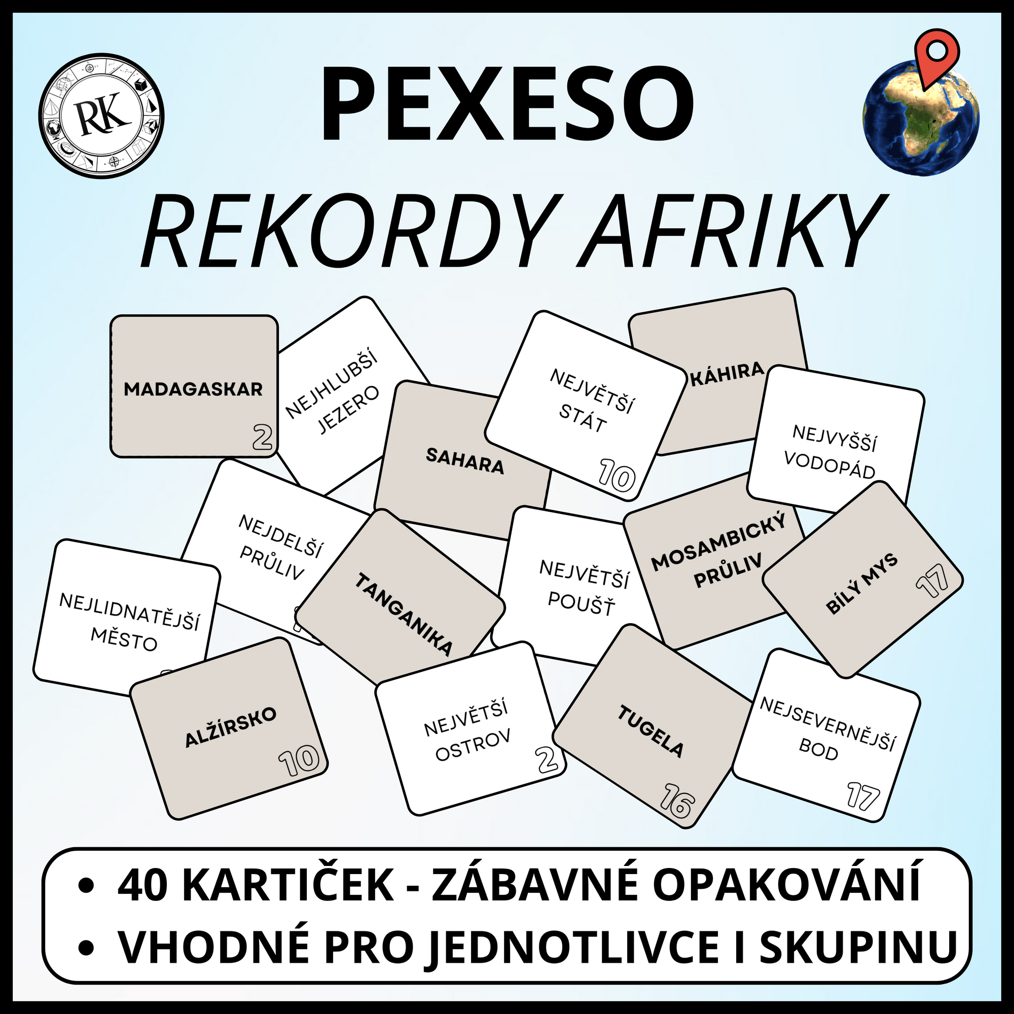 Vzdělávací materiál obsahuje kartičky (pexeso) na rekordy Afriky. Doporučuji materiál vytisknout, zalaminovat a podél čar rozstříhat (vznikne 40 kartiček).