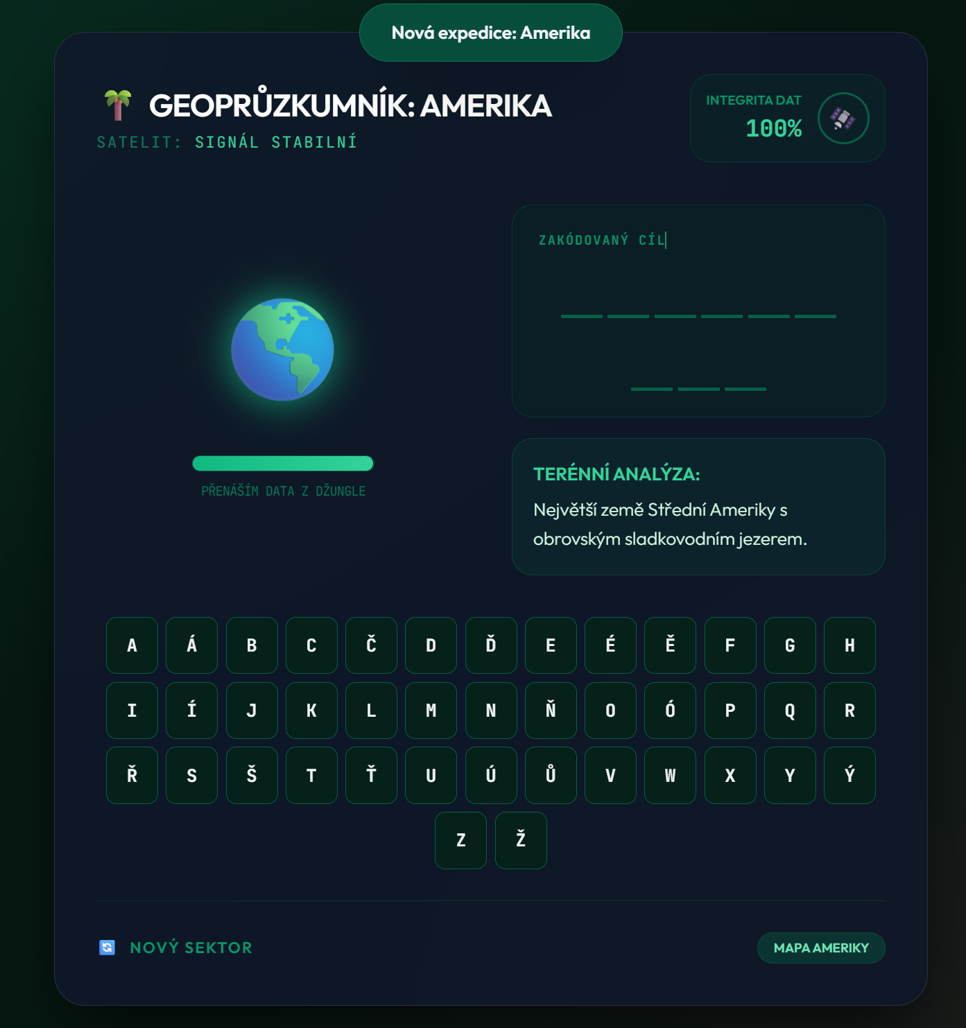 Geoprůzkumník Amerika je interaktivní digitální hra typu „šibenice“, která žáky přenáší do role operátorů satelitního systému v prostředí americké džungle. Cílem je identifikovat státy Severní, Střední a Jižní Ameriky na základě odborných geografických a kulturních indicií.