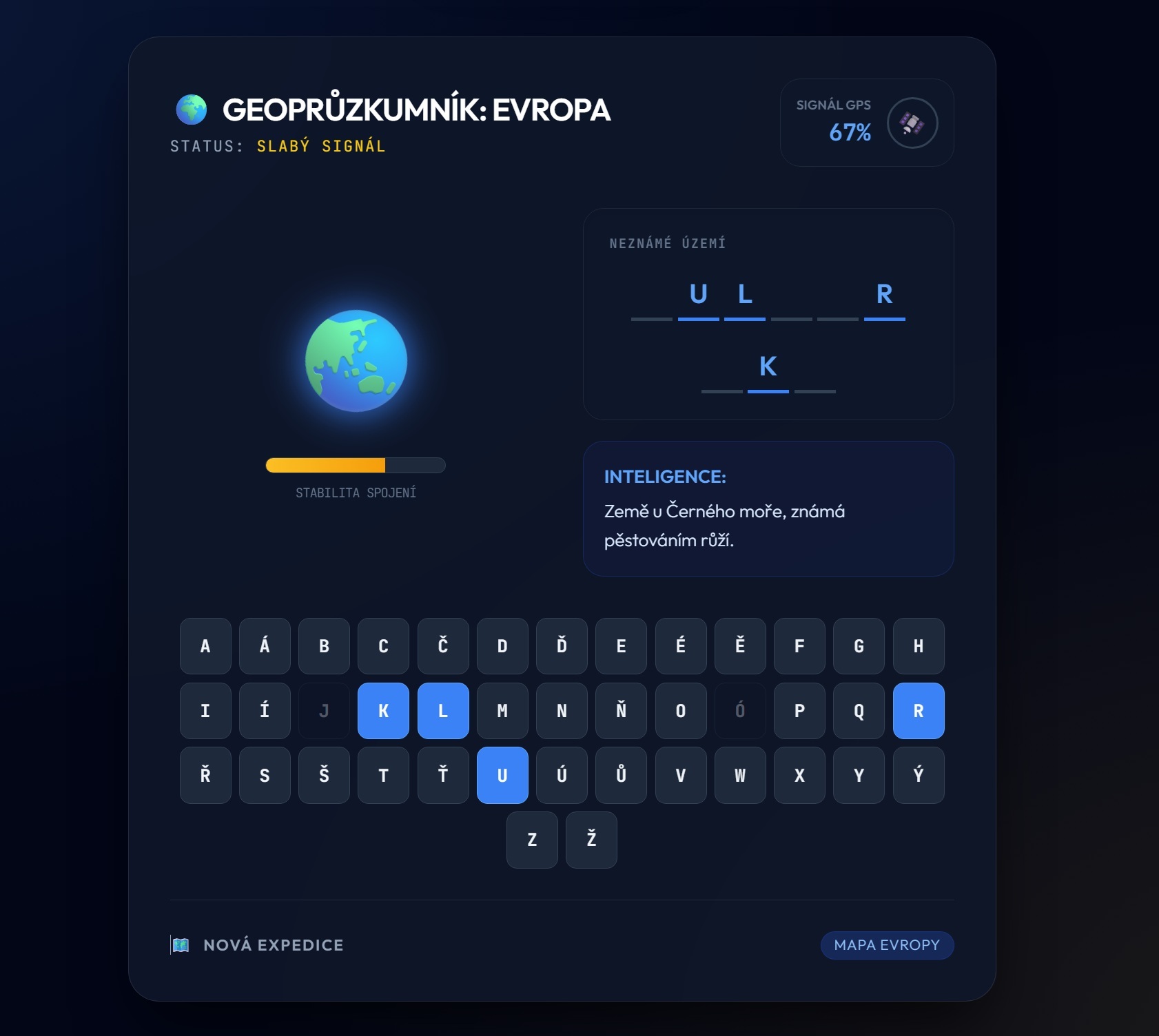 - Vizuální mechanika (GPS signál): Namísto tradičního oběšence hra využívá ukazatel „Stability GPS spojení“. S každým chybným písmenem klesá procentuální integrita signálu a glóbus mění svou podobu, dokud nedojde k úplné ztrátě spojení.