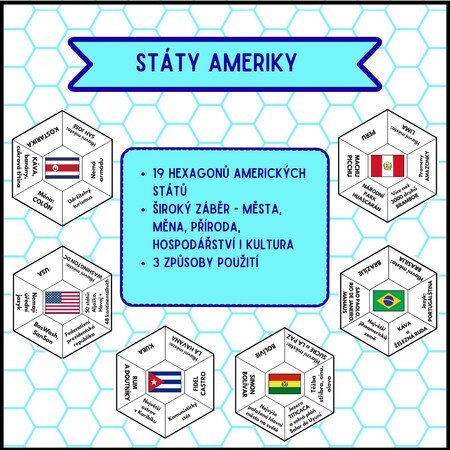 Tento výukový materiál slouží k procvičování a fixaci učiva regionální geografie Ameriky. Je připraven k okamžitému tisku a obsahuje detailní metodický list, který vám nabídne několik způsobů, jak hexagony zařadit do výuky, ať už jako rychlé opakování, nebo jako hlavní náplň hodiny.