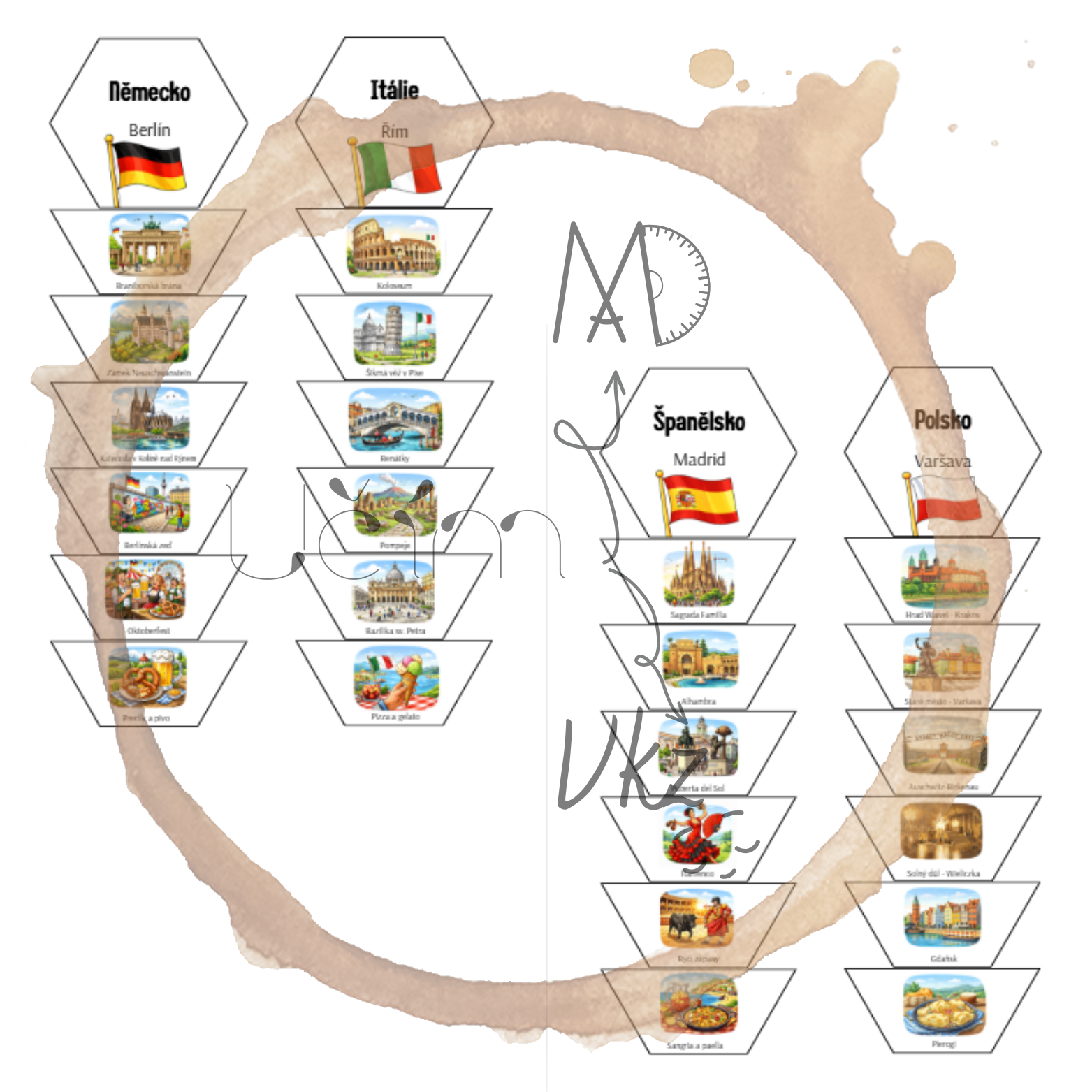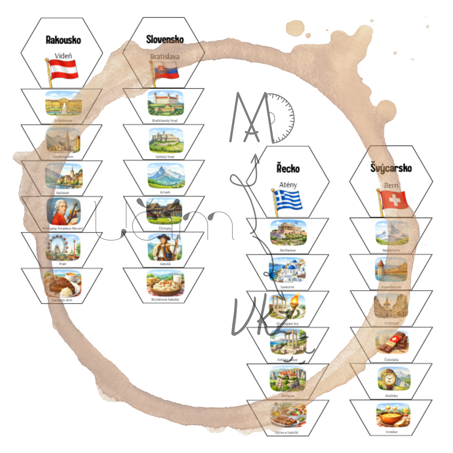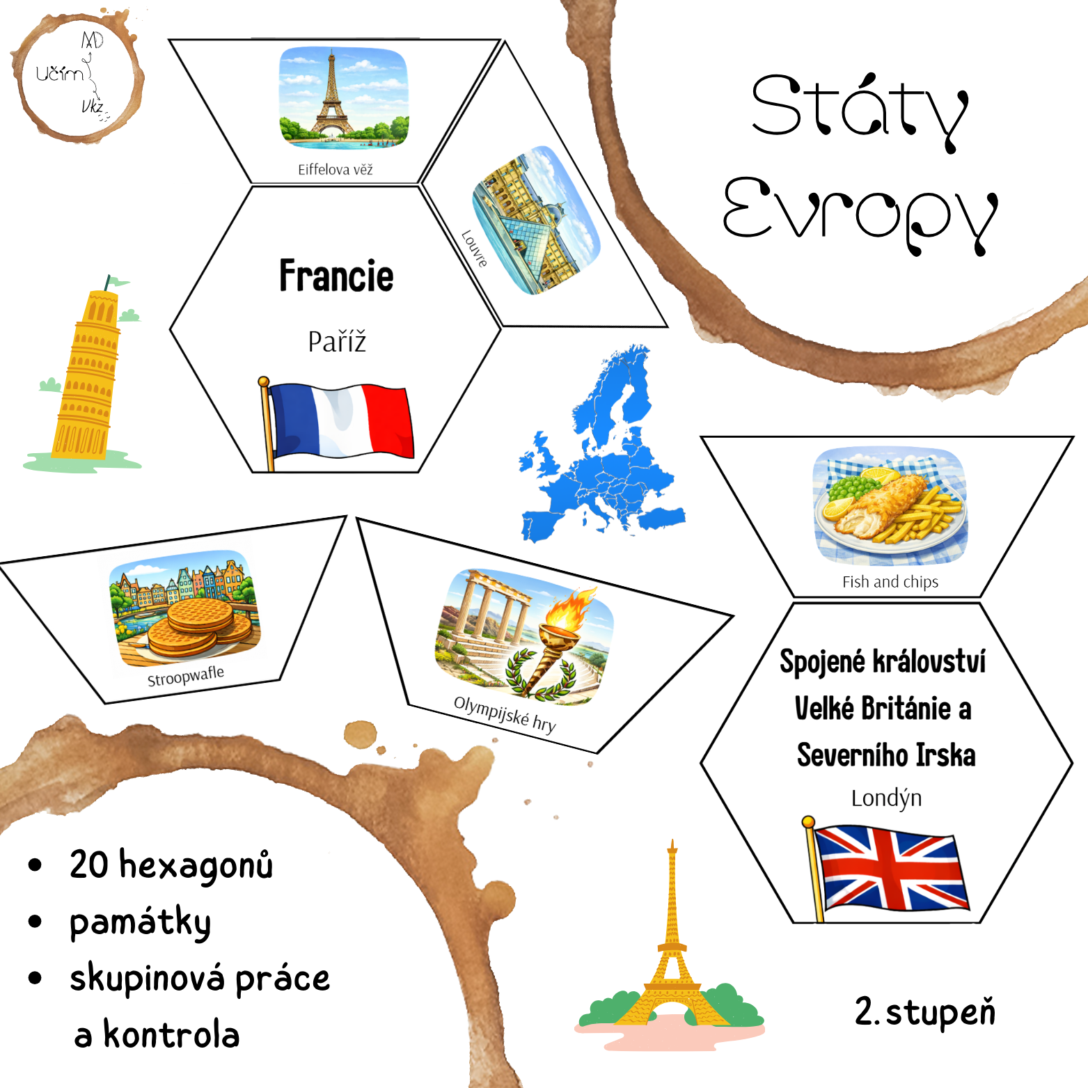 Materiál obsahuje 20 hexagonů zaměřených na vybrané státy Evropy (hlavní město, vlajka a šest charakteristických míst či symbolů každého státu).