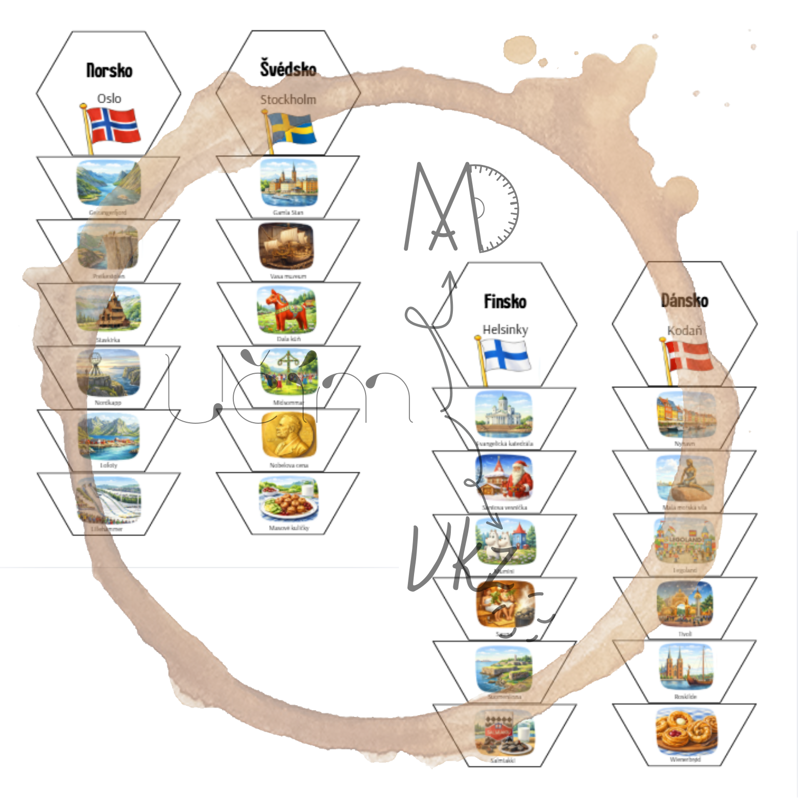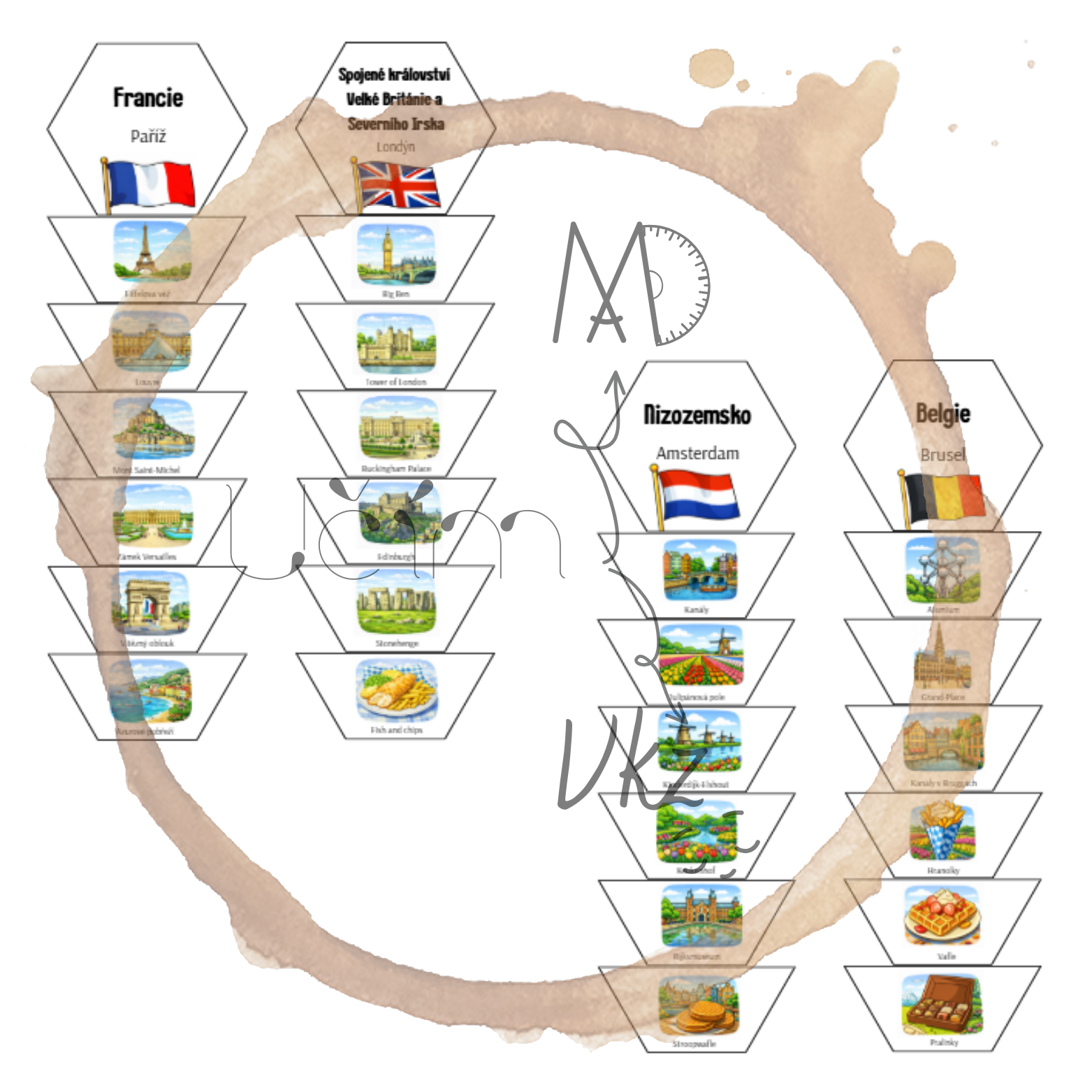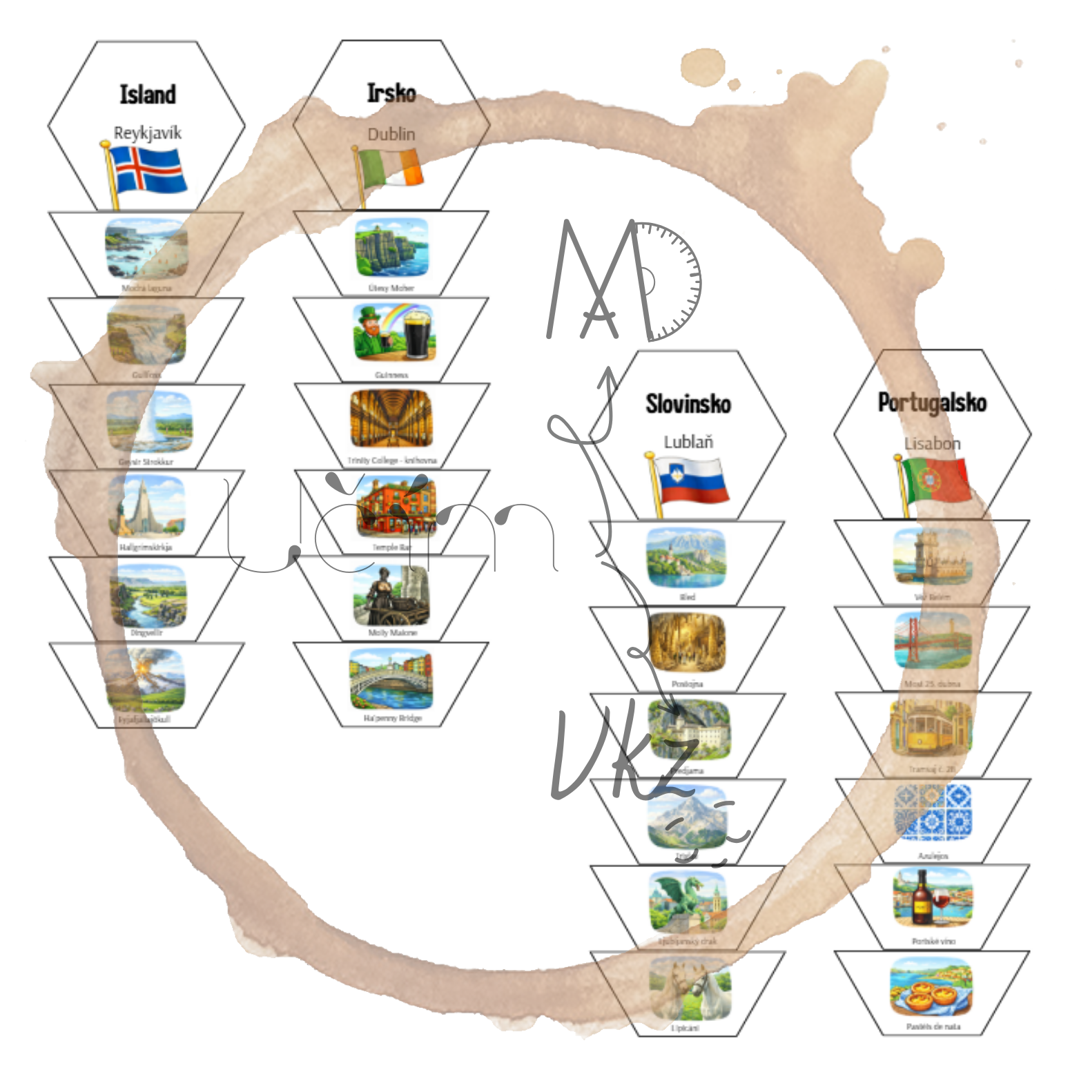 Materiál obsahuje 20 hexagonů zaměřených na vybrané státy Evropy (hlavní město, vlajka a šest charakteristických míst či symbolů každého státu).