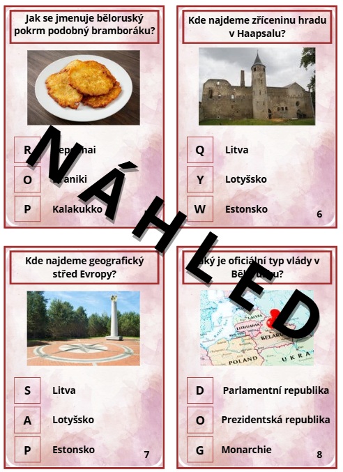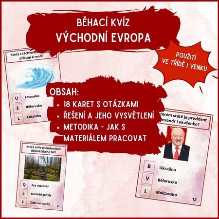 Žáci si prostřednictvím kvízu hravou formou opakují a upevňují znalosti o zemích východní Evropy (geografie, kultura, historie, zajímavosti). Materiál je vhodný pro vnitřní i venkovní prostory (třída, chodba, školní zahrada).