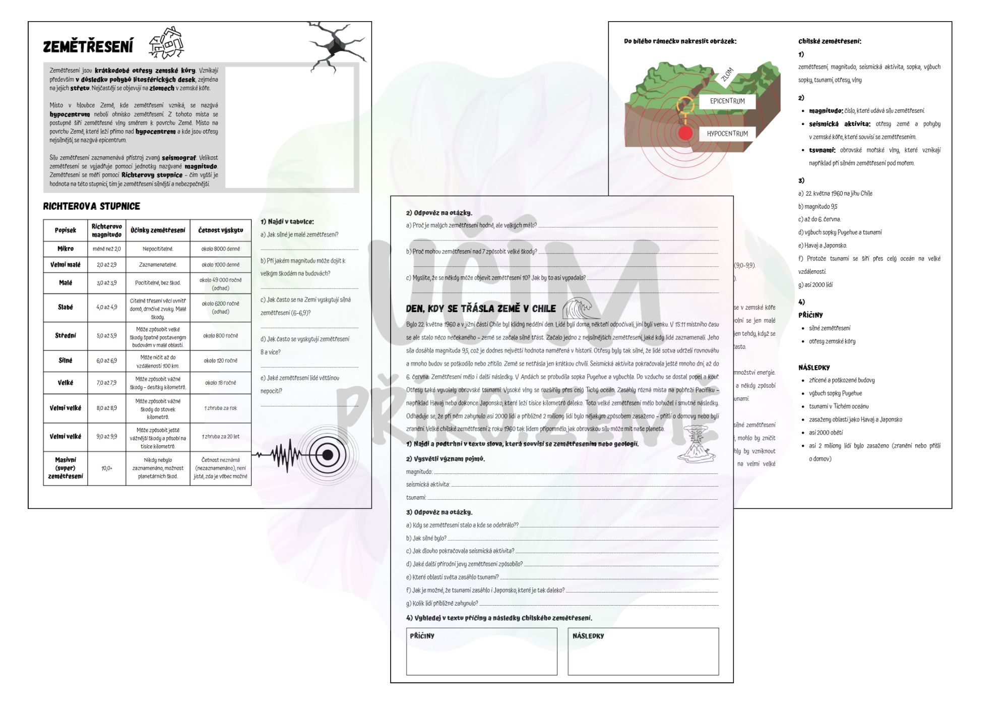 Druhá část materiálu pracuje s krátkým příběhem o velkém chilském zemětřesení z roku 1960. Žáci zde rozvíjejí čtení s porozuměním, vysvětlují pojmy, odpovídají na otázky a hledají v textu příčiny a následky přírodní katastrofy. Materiál tak propojuje zeměpisné učivo s rozvojem práce s textem a logickým uvažováním.