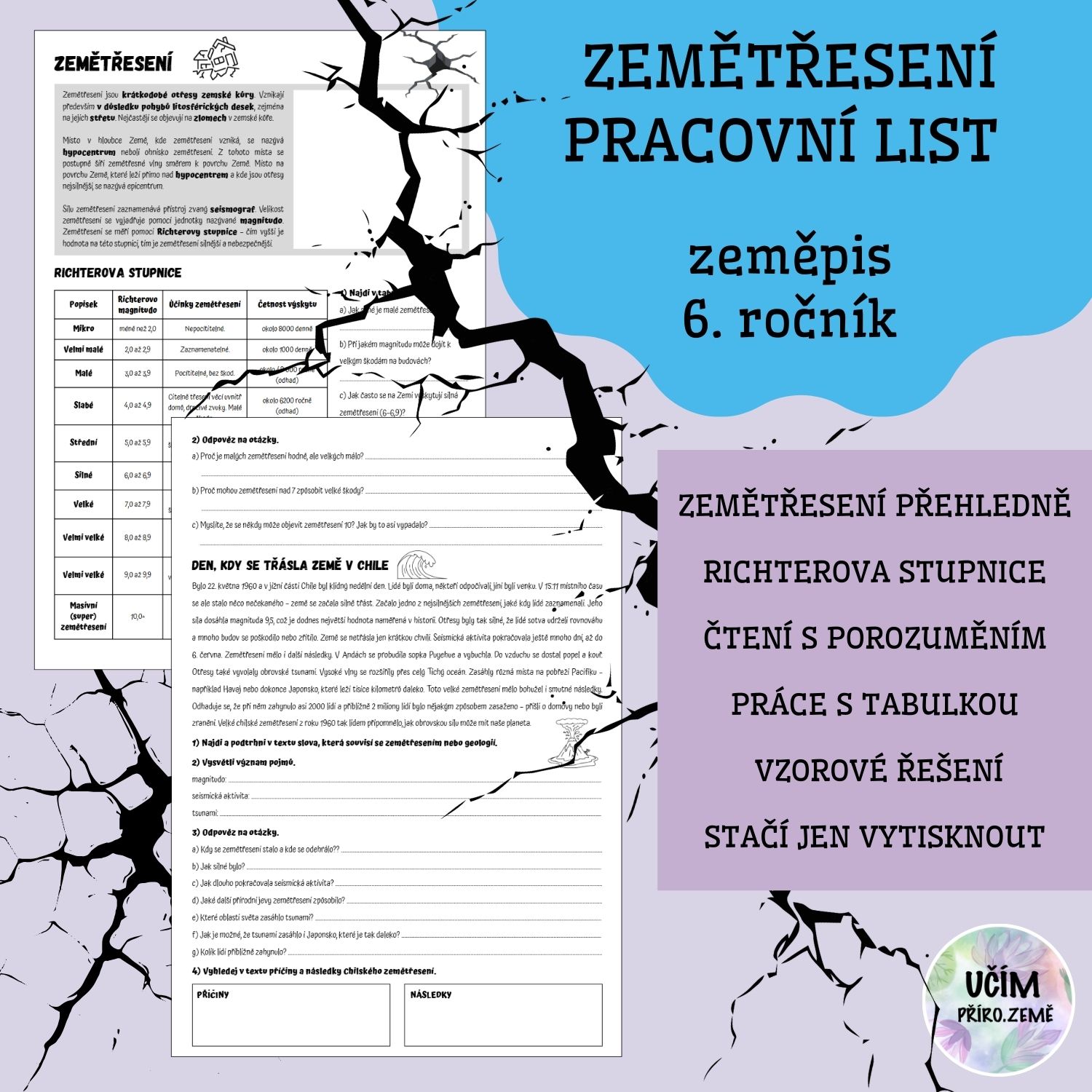 Hledáte přehledný a smysluplný pracovní list k tématu zemětřesení, který zvládnou žáci 6. ročníku samostatně vyplnit a zároveň je bude bavit? Tento materiál nabízí jednoduché vysvětlení základních pojmů i aktivní práci s informacemi. Žáci se seznámí s tím, proč zemětřesení vznikají, kde se objevují a jak se měří jejich síla. Součástí pracovního listu je také přehledná Richterova stupnice, se kterou žáci vyhledávají informace a učí se pracovat s tabulkou.