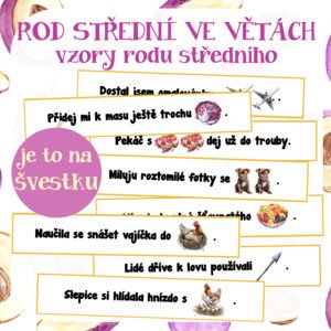 Materiál obsahuje 56 různých vět, ve kterých jsou místo slov rodu středního obrázky. Žáci věty mohou přepisovat a