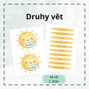 Popis: Materiál slouží k procvičení druhů vět. Obsahuje 48 vět, včetně řešení. Práce s materiálem: Listy vytiskneme