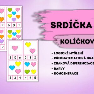 Soubor o 3 stranách, obsahuje 10 karet ke kolíčkování se srdíkovou tématikou. Počty od 1 do 10. Jedná se o výukový