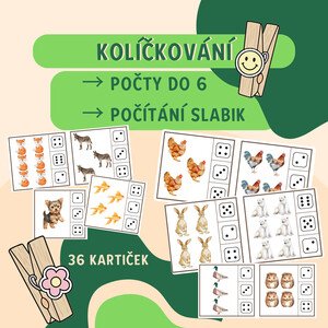 V materiálu najdete 6 stran kartiček se zvířátky určených ke kolíčkování (dohromady 36 kartiček). Materiál můžeme využít
