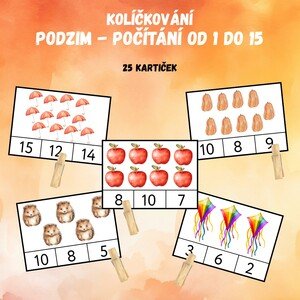 Sada obsahuje 25 karet s podzimními obrázky - děti na nich počítají předměty (1–15) a pomocí kolíčků, kamínků nebo