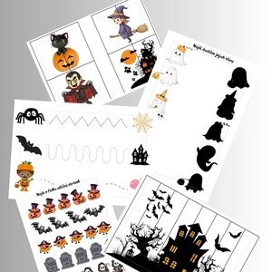 Halloweenské aktivity obsahují 11 stránek hledání stejných, odlišných obrázků, struktur, dvojic, které k sobě patří