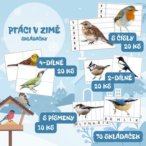 Soubor obsahuje celkem 70 skládaček s obrázky ptáků. V souboru naleznete: 20 skládaček s čísly, 10 skládaček s písmeny