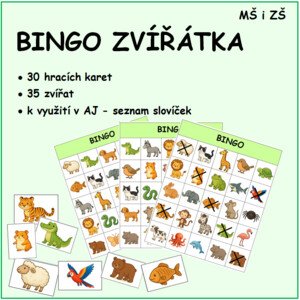 Bingo je zábavná hra pro celou třídu i skupinu menších dětí. Materiál obsahuje 35 ukázkových kartiček zvířat, 30 hracích