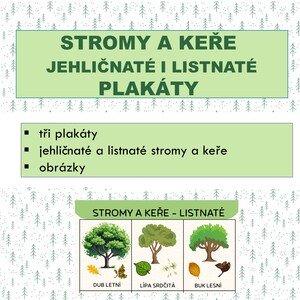 Materiál obsahuje tři plakáty s rozdělením jehličnatých a listnatých stromů a keřů jejich obrázky. Lze vytisknout na
