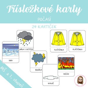 Sada 24 trojic obrázků a slov na téma počasí. Děti se učí poznávat, pojmenovávat a číst výrazy spojené s různými