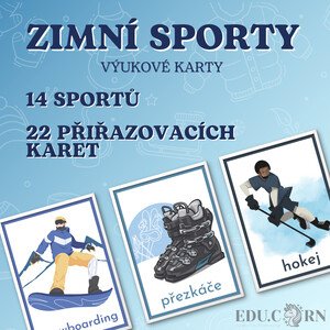 Výukové obrázkové karty tematicky zaměřené na zimní sporty a potřebné vybavení. Celkem 30 karet velikosti A4 a