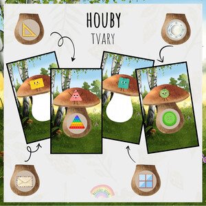 Soubor obsahuje 16 kartiček s houbami, které jsou rozděleny na dvě části – klobouček a nožka. Každý klobouček znázorňuje