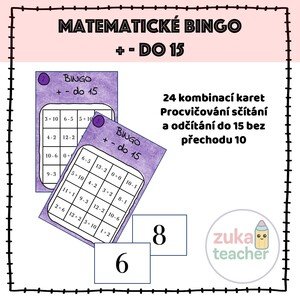 Hra BINGO (sčítání a odčítání do 15 bez přechodu 10) Materiál obsahuje 24 možných kombinací na kartách bingo. Obsahuje