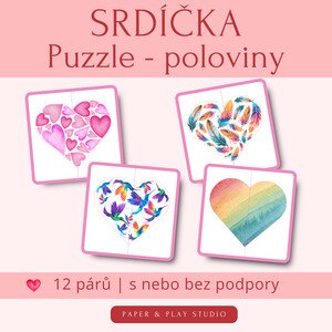 Puzzle aktivita s motivem srdíček zaměřená na rozvoj zrakového vnímání, pozornosti a jemné motoriky. 12 párů, 2 možnosti použití.