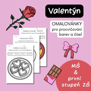 Valentýnské omalovánky podle čísel jsou určeny pro děti v MŠ a na 1. stupni ZŠ. Soubor obsahuje 6 omalovánek, řešení a