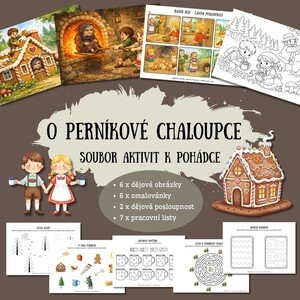 Soubor kombinuje barevné dějové ilustrace s identickými omalovánkami a tematickými úkoly na téma "Perníková chaloupka"