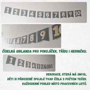 Číselná girlanda 1–10 určená k výzdobě dětského prostoru. Vhodná do pokojíčku, třídy i herničky jako stálý vizuální