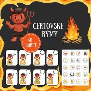 Soubor obsahuje 40 rýmů (40 karet + 40 obrázků koleček) v PDF. V pytli každého čerta se nachází obrázek, který se rýmuje
