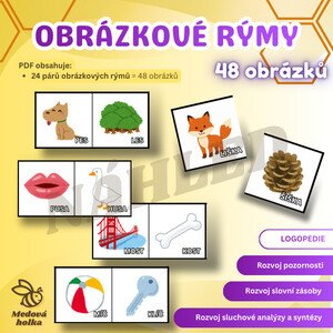Tento materiál obsahuje celkem 24 dvojic obrázkových rýmů. Aktivita podporuje schopnost dětí vnímat zvukovou strukturu