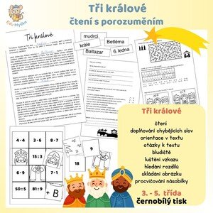 Najdete zde: * text o třech králích, kde chybí 5 slov. Chybějící slova může vyučující rozmístit po třídě. Žáci je