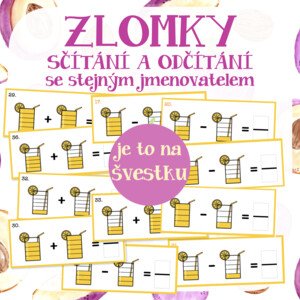 Materiál obsahuje 42 různých kartiček na sčítání a 42 kartiček na odčítání zlomků se stejným jmenovatelem. Vhodné jsou