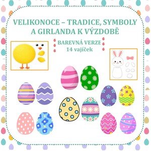 Tvořivý velikonoční materiál nabízí šablony zvířátek a vajíček k vybarvení i vystřihování, girlandu k výzdobě a přehled
