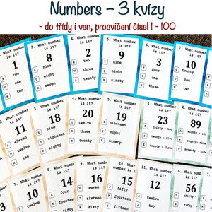 Materiál obsahuje 19 A4 stran – 3 kvízy (čísla 1 – 10, 1 – 20, 1 – 100). Obsahuje karty s otázkami barevně rozlišené a