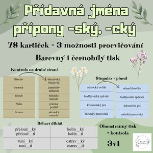 Oboustranné kartičky! 3v1 Didaktická pomůcka k procvičení přípon u přídavných jmen -ský/-ští, -cký/-čtí. Soubor obsahuje