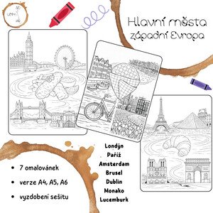 Materiál obsahuje 5 omalovánek hlavních měst Evropy. Verze A4, A5 i A6. Hlavní města: Londýn Paříž Amsterdam Brusel