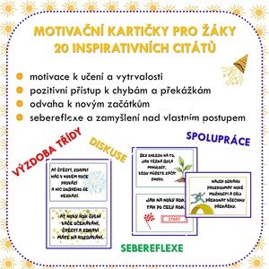 Obsah materiálu: Materiál obsahuje na 10 A4 stranách 20 motivačních a inspirativních citátů. Karty jsou barevné
