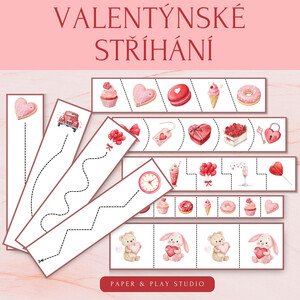 Valentýnské stříhání s rostoucí obtížností pro deti 3-6 let. Děti trénují jemnou motoriku, jistotu v práci s nůžkami i přípravu na psaní.