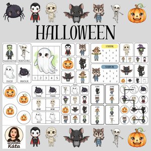 HALLOWEEN Soubor obsahuje: Demonstrační obrázky Půlené obrázky Kolíčkovanou Skládačky s čísly Hledání písmen Třísložkové