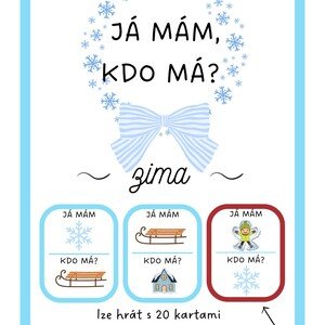 Zábavná hra "Já mám, kdo má?", kterou lze využít pro mladší děti jako domino. Tematicky laděná do zimního období.