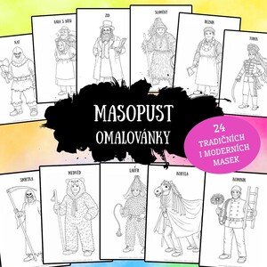 🎭 24 omalovánek představující pestrou přehlídku masopustních postav – od těch nejtradičnějších masek až po postavy