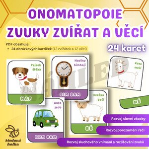 Materiál Onomatopoie - zvuky zvířat a věcí je zaměřen na hravou podporu rozvoje řeči a sluchového vnímání u dětí